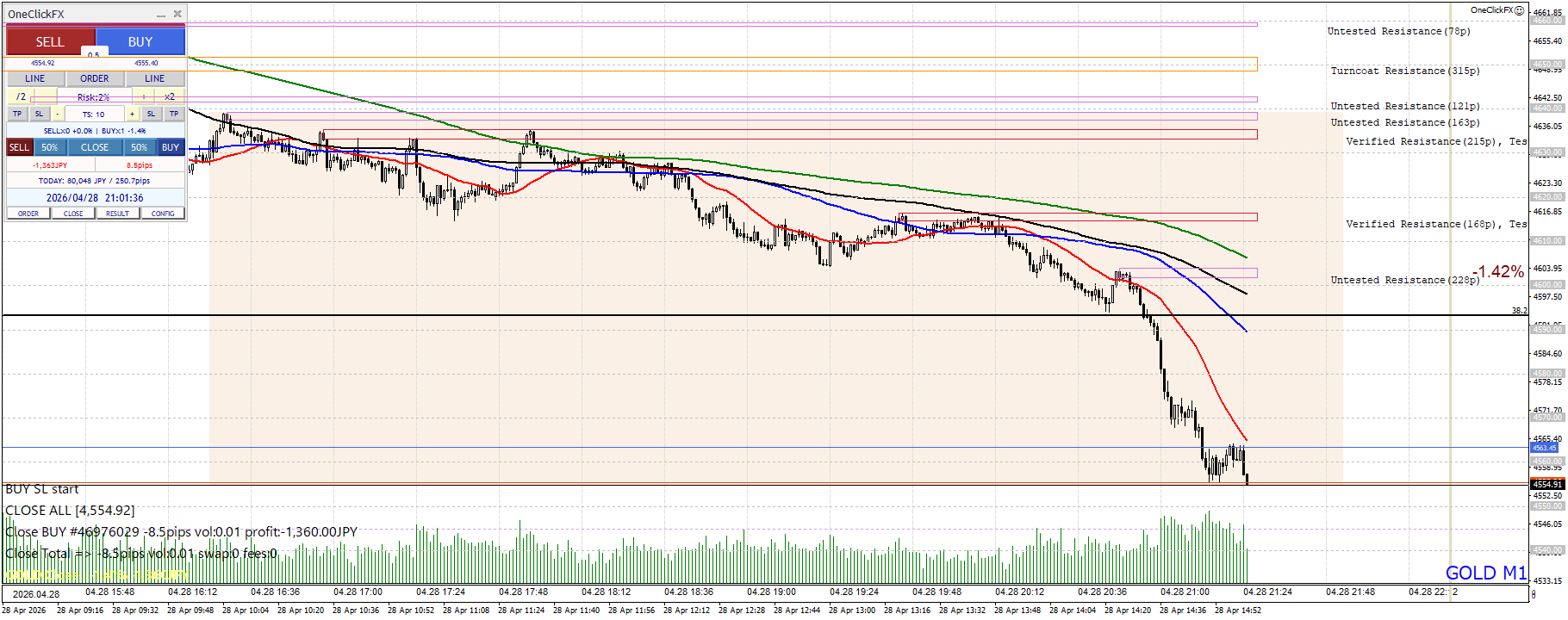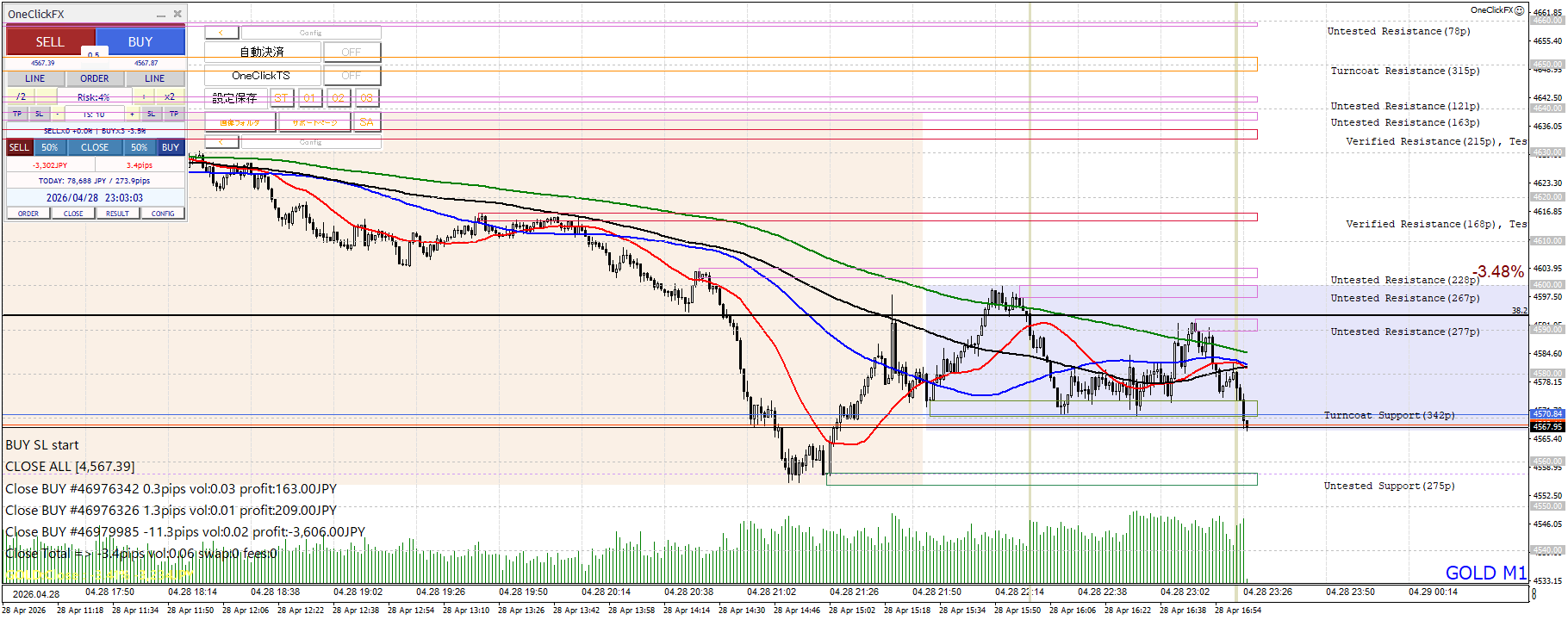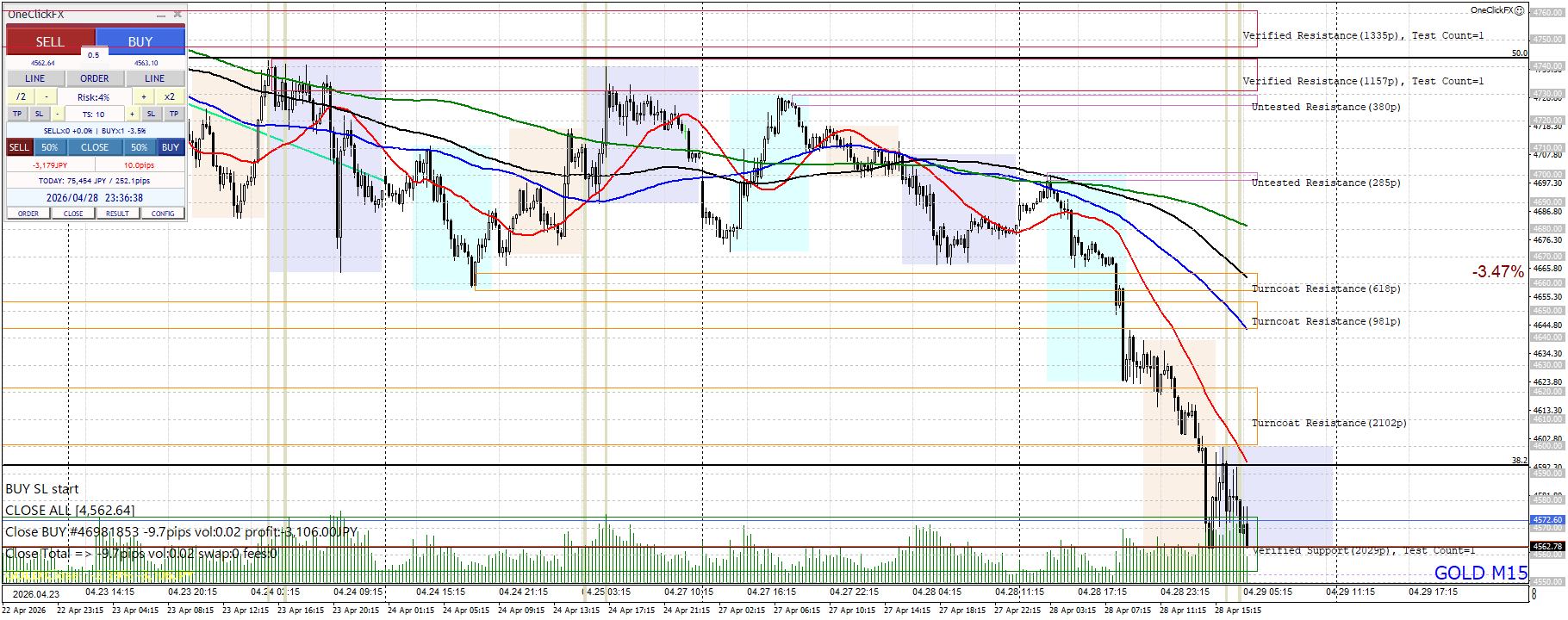 2026年4月28日(Tue)のGOLDは、-15分足(M15)の- 下降2波(戻り形成中)で臨んだものの、結果は-3,106円(RR 7.11)。