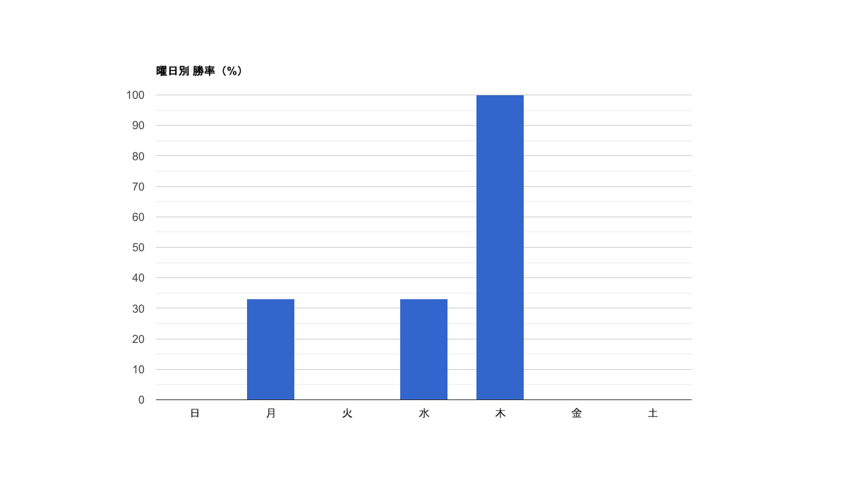 曜日別の勝率を分析すると、木曜日のロンドン時間で100%の勝率を記録していますが、他の曜日では取引が少なく、特に月曜日と水曜日のロンドン時間で勝率33%と低調です。金曜日のデータがないため、週末の動きに対する戦略も考慮する必要があります。