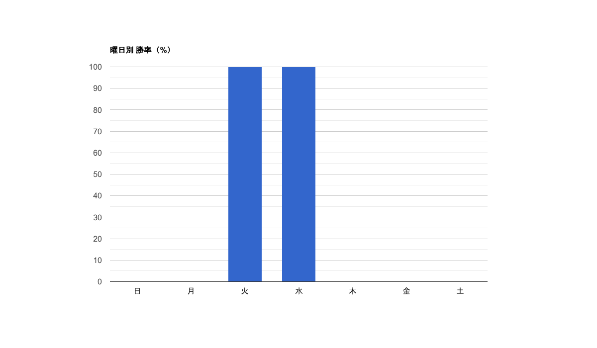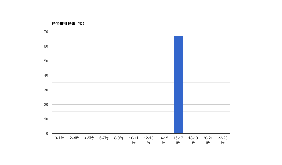 曜日・時間帯別の勝率を見ると、ロンドン市場の火曜日と水曜日に100%の勝率を記録していますが、土曜日のロンドン市場では0%となっています。特に、ロンドン市場の取引が好調な一方で、土曜日の取引は避けた方が良いかもしれません。今週のデータからは、ロンドン市場での取引に集中することが有効であると考えられます。