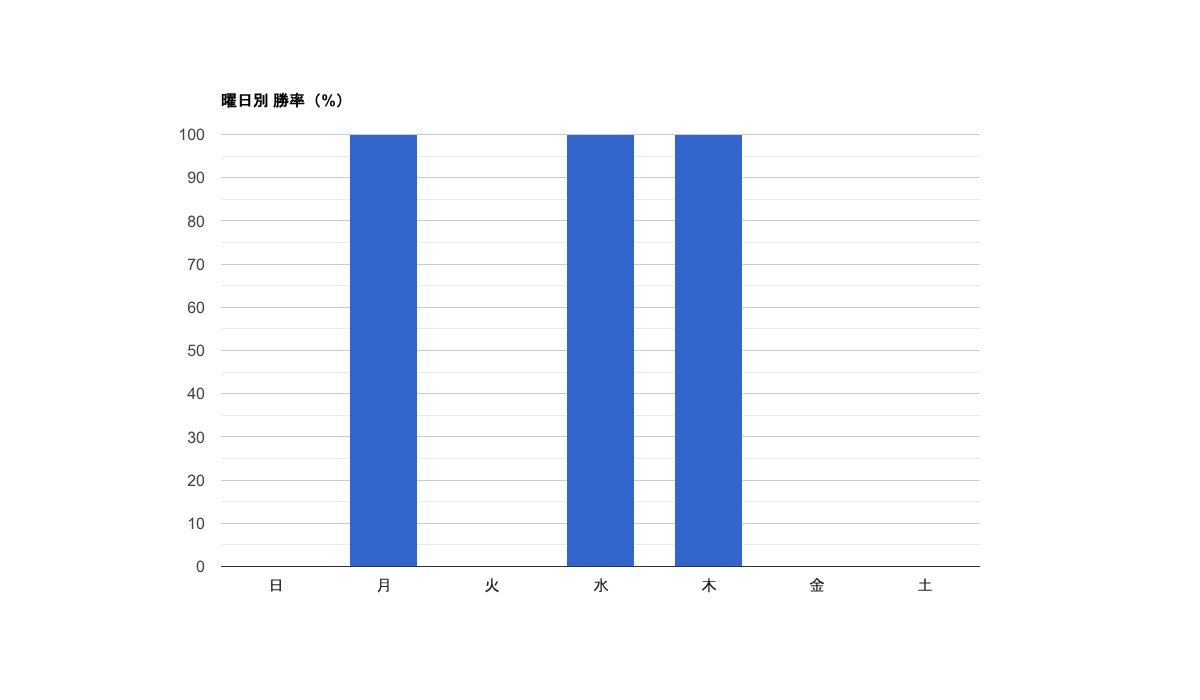 勝率75%は非常に高く、取引手法の精度が高いことを示しています。平均RRが3.32であることから、リスクに対するリターンがしっかりと確保されています。期待値56,300円も良好ですが、週次DDが15.61%と高いため、リスク管理にさらなる注意が必要です。特に、目標の週次DD6.00%以内を達成するために、リスク管理の強化が求められます。
